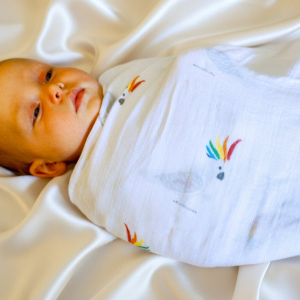 Celebrate universal love and equality with a Rainbow Cockatoo baby muslin swaddle.